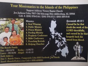 Missionary Name: Dax Baarde Missionary To: Philippines Address: Dax U Baarde Estaca,. compostela Cebu 6003 Missionary Email: dbaarde@yahoo.com No current website available Home Church: Victory Baptist Church, Childersburg, AL 35004 Phone: 0998-4698005 Email Missionary Recent Newsletter Email Missionary You are emailing Baarde Family.